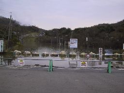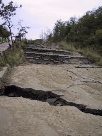 ここも本来ならば普通の舗装道路。 アスファルトが引き裂かれて、奥のほうはまるで階段のよう 。 歩道だったところ(?)が遊歩道へのアプローチとして転用されている。 |