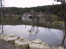北海道の名物土産「わかさいも」の工場。 画面中央でつぶれている建物。 火口のすぐ脇に位置していたため被災してしまった。 |