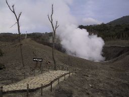 付近は西山火口散策路として遊歩道が整備。 普通の格好で訪れることが可能。 今でもいたるところから地熱が吹き出ている。 火山灰に埋もれて焼け焦げた木がいたるところに残る。 |