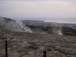 遊歩道の先端。 遠くには洞爺の市街と太平洋が眺められる。 遊歩道のすぐ脇でも小規模な噴出しがあった。 |