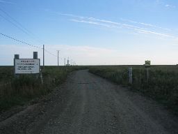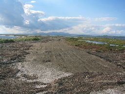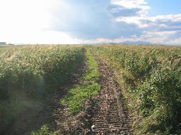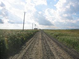 轍のある砂利道がひたすら一直線に伸びる。 |