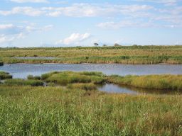 道路の右側に湿原が広がる。 |