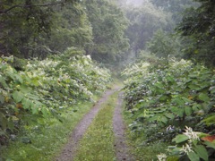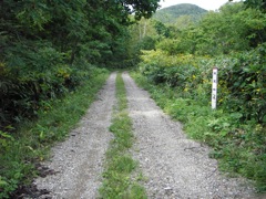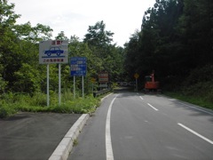 起点から5km以上の直線が尽きると寸断地点...のはずがそのまま林道となってしまった。